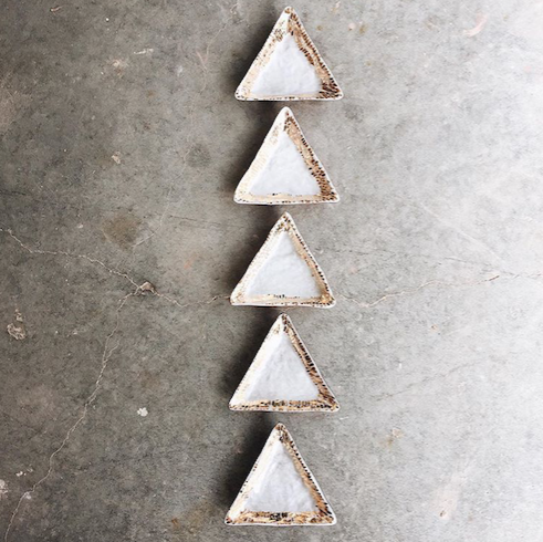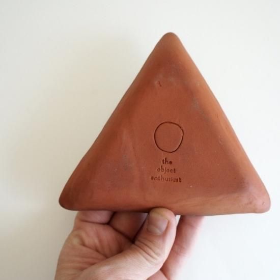 トライアングルトレイは深い赤色の陶器粘土を使用し、仕上げには光沢のある白い釉薬が施されている。22kのゴ−ルド輝きがトレイのアクセントに。