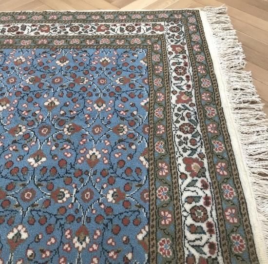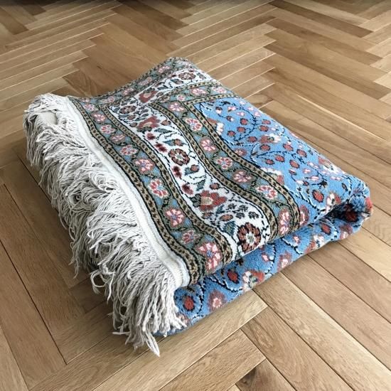 ダスティーピンク、ピーチ、スカイブルー、クリームの色使いに女性らしい花のデザインがなんとも上品な手織りのビンテージラグ。