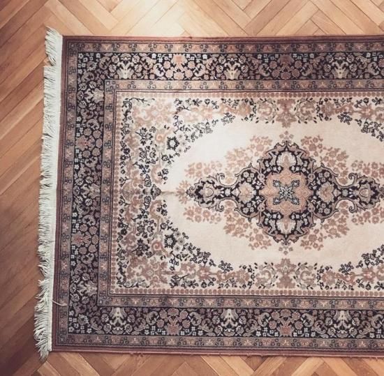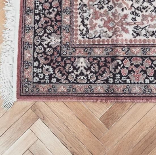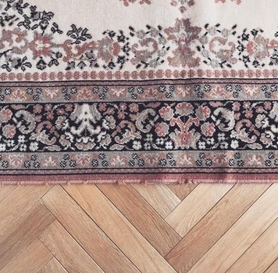 ペールピンクとベージュの上品な配色で、クラシカルなデザインのビンテージラグ。