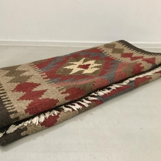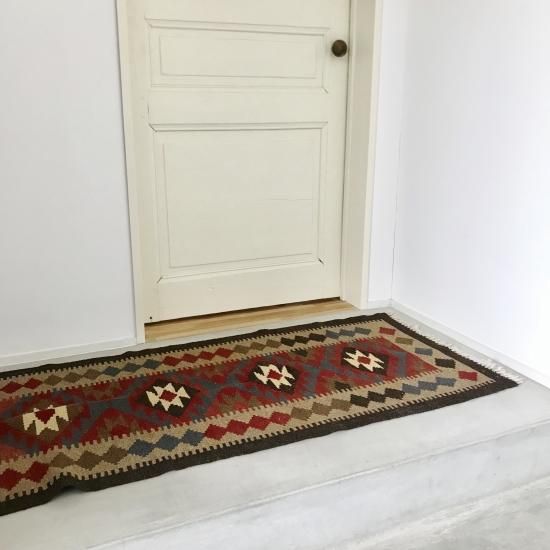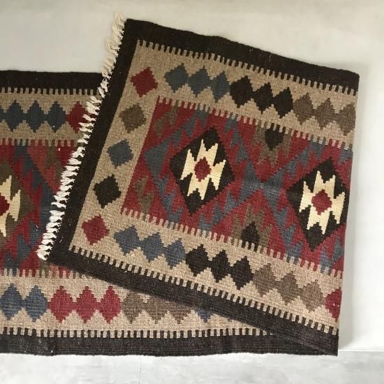 バーガンディ、ダークグレー、クリームにチョコレート。落ち着いた色目で構成されているので、ナチュラルカラーの床材にも馴染みやすいウールキルムです。