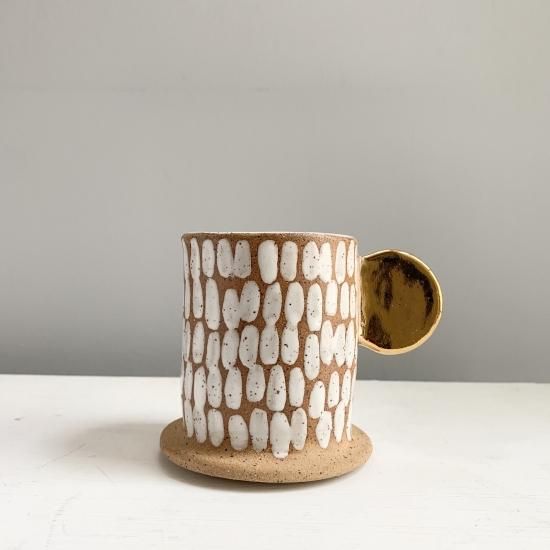 土感を感じられる黄褐色のボディに艶感のある22kゴ−ルドを持ち手部分につけるという